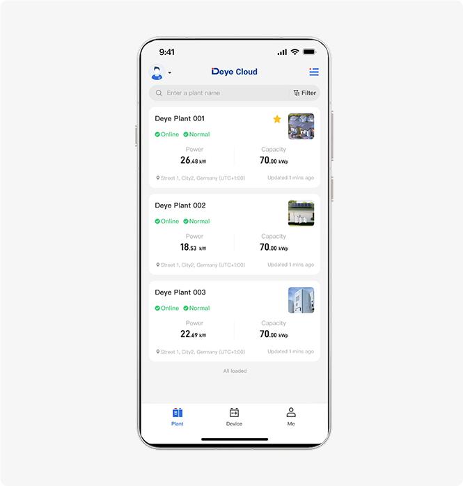 Sfruttando la piattaforma cloud Deye, forniamo una gestione centralizzata attraverso le centrali elettriche, migliorando significativamente il valore complessivo per i nostri clienti.