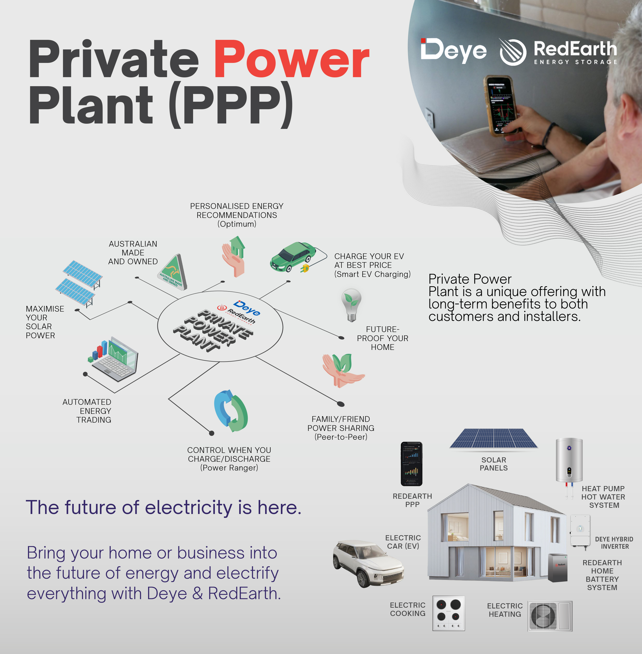 Deye è onorato di annunciare la partnership con Redearth dopo il successo di estesi test della gamma avanzata di Inverter Hybrid di Deye con la piattaforma software PRIVE PRIMAZIONE (PPP) di Redearth che massimizza i rendimenti finanziari per gli utenti finali in Australia attraverso la gestione dinamica dell'energia. Redearth ha anche certificato la loro popolare batteria TROPPO per l'uso con inverter Deye LV. Redearth offre ora una serie di sistemi BESS all-in-one utilizzando Deye Inverter e Troppo Battery, che sono ora disponibili per la vendita in Australia e nel Sud Pacifico e compatibili sulla piattaforma di centrale elettrica privata (PPP) di Redearth.
